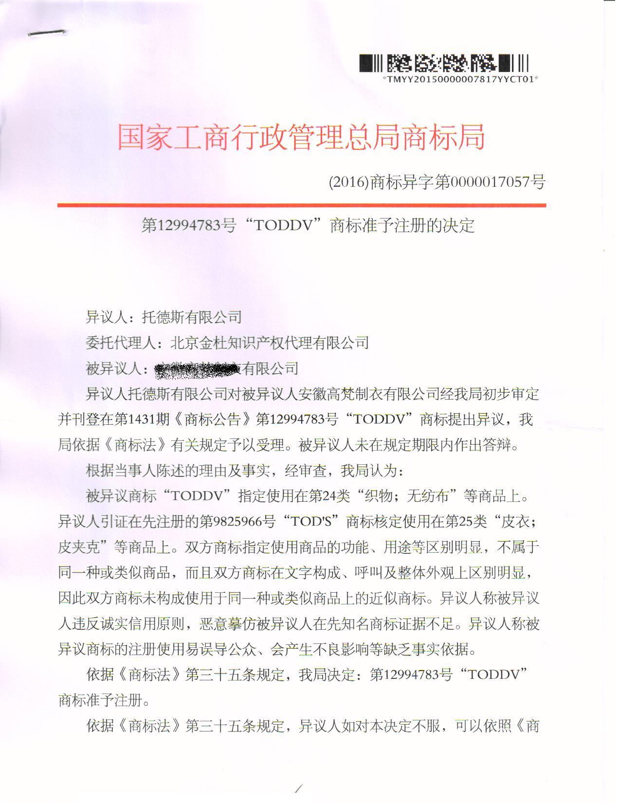 商标准予注册的决定