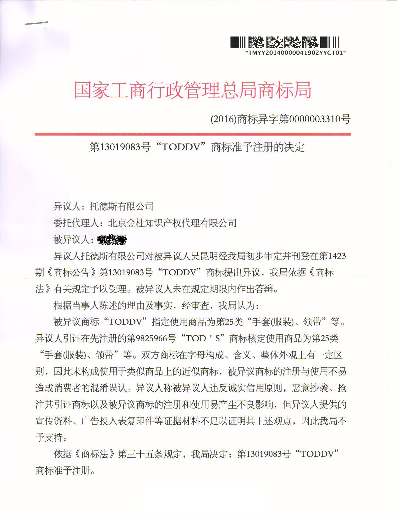 异议答辩成功裁定