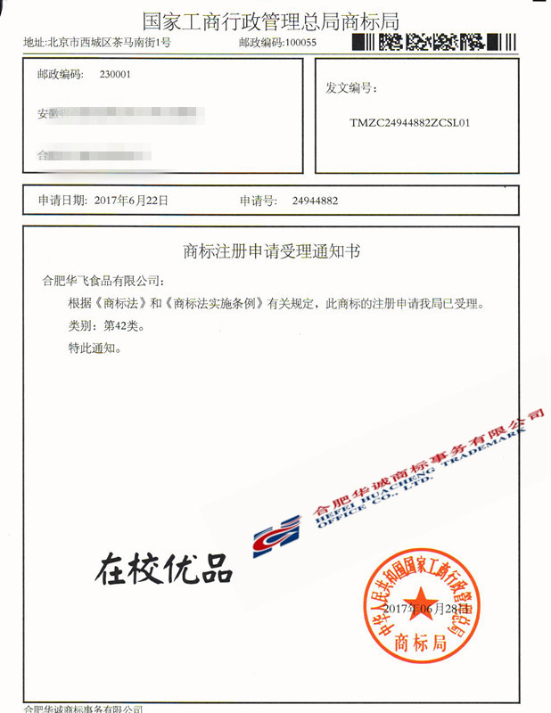 您委托我所代理商标注册申请,名称为“在校优品”42类商标已被国家商标局受理。