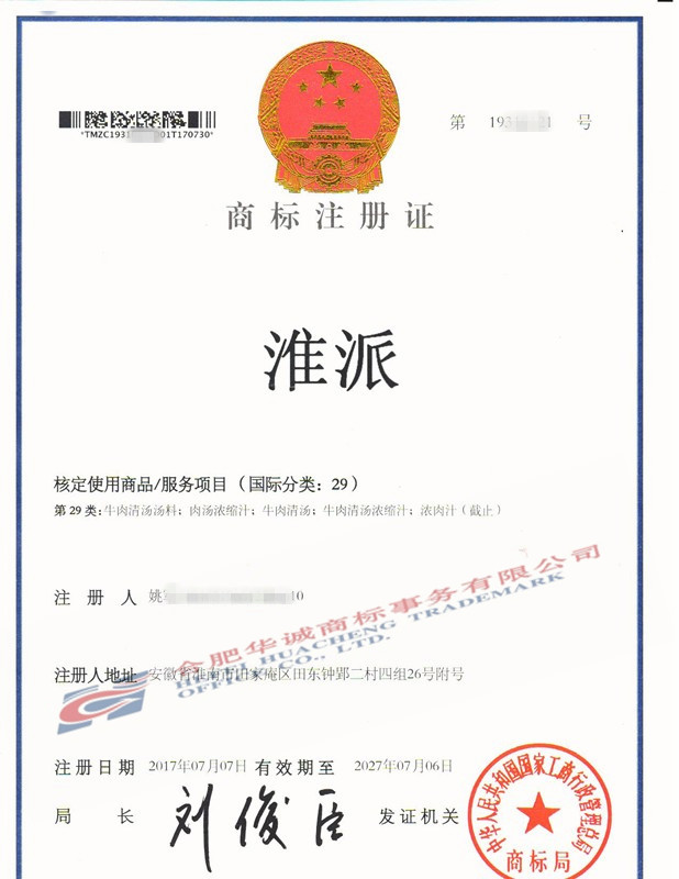您委托我所代理商标注册申请,名称为“淮派”29类商标注册证已下达。