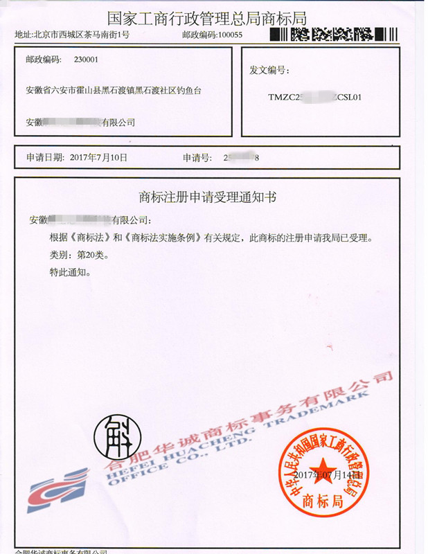 您委托我所代理商标注册申请,名称为“斛”20类商标已被国家商标局受理。