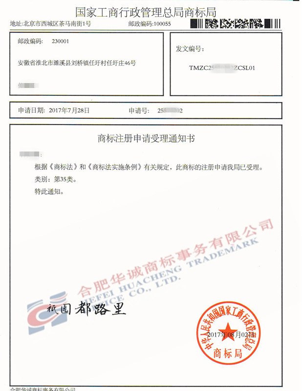 您委托我所代理商标注册申请,名称为“袛园都路里”35类商标已被国家商标局受理。