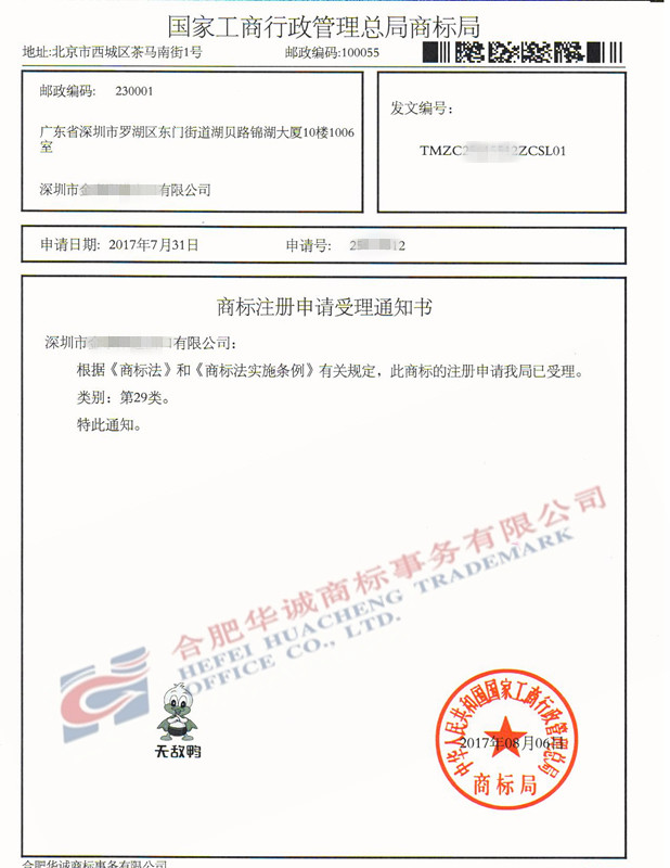 您委托我所代理商标注册申请,名称为“无敌鸭”29类商标已被国家商标局受理。