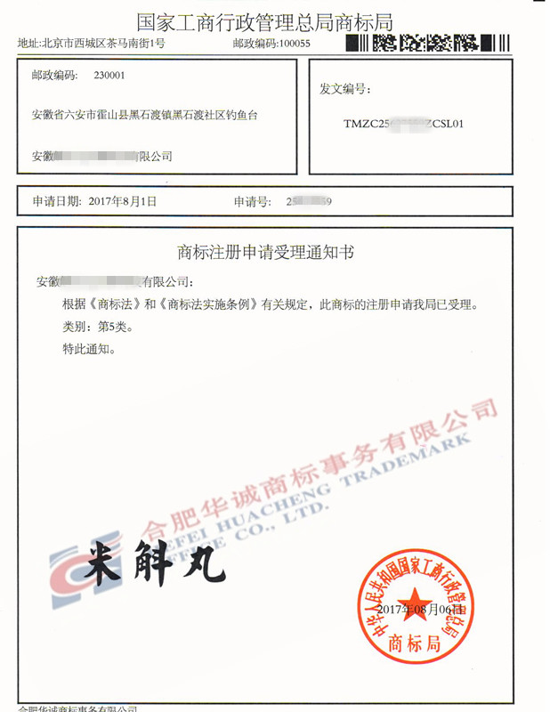 您委托我所代理商标注册申请,名称为“米斛丸”5类商标已被国家商标局受理。