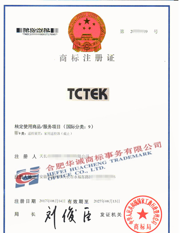 您委托我所代理商标注册申请,名称为“TCTEK” 9类商标注册证已下达。