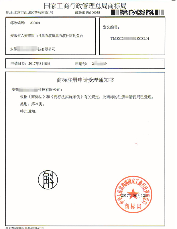 您委托我所代理商标注册申请,名称为“斛” 20、21、25、三类商标已被国家商标局受理。