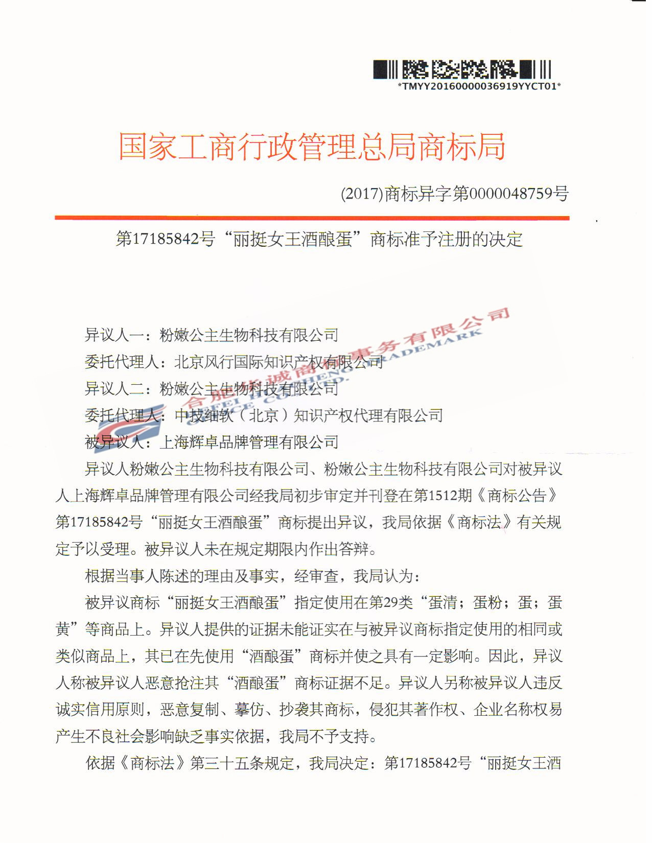 “丽挺女王酒酿蛋” 商标准予注册的决定