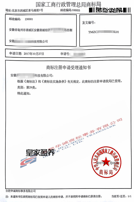 您委托我所代理商标注册申请,名称为“皇家盈养”29、30、32、35类商标已被国家商标局受理。