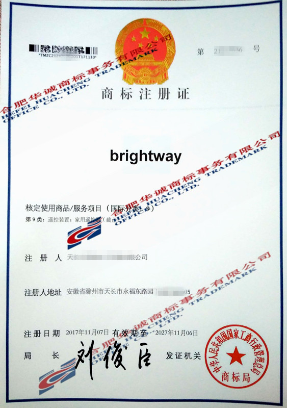 您委托我所代理商标注册申请,名称为“brightway” 9类商标注册证已下达。