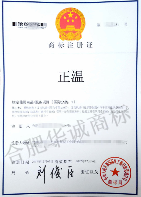 “正温”1类商标注册证下达