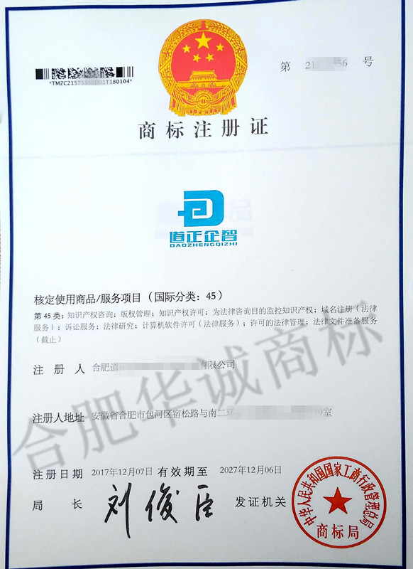 您委托我所代理商标注册申请,名称为“道正企智”45类商标注册证已下达。