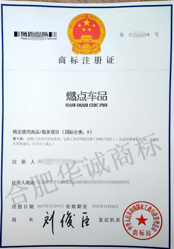 “燃点车品”9类商标注册证下达