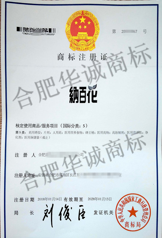 您委托我所代理商标注册申请,名称为“纳百花” 5类商标注册证已下达。