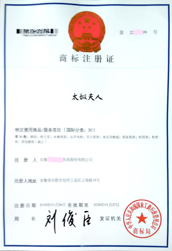 您委托我所代理商标注册申请,名称为“太姒夫人” 30类商标注册证已下达。