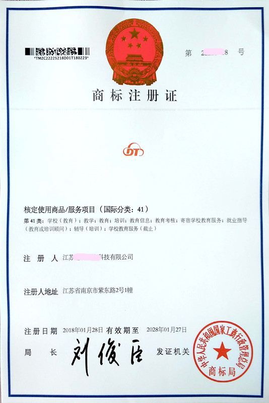 您委托我所代理商标注册申请,名称为“DT” 41类商标注册证已下达。