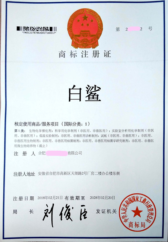 “白鲨”1类商标注册证下达