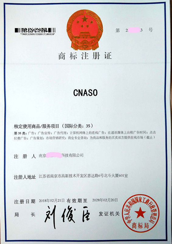 您委托我所代理商标注册申请,名称为“CNASO”35类、42类商标注册证已下达。