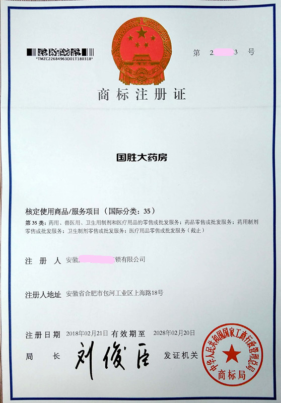 您委托我所代理商标注册申请,名称为“国胜大药房”35类商标注册证已下达。