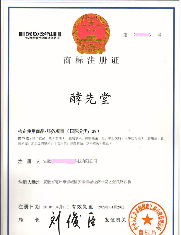 “酵先堂”29类商标注册证下达