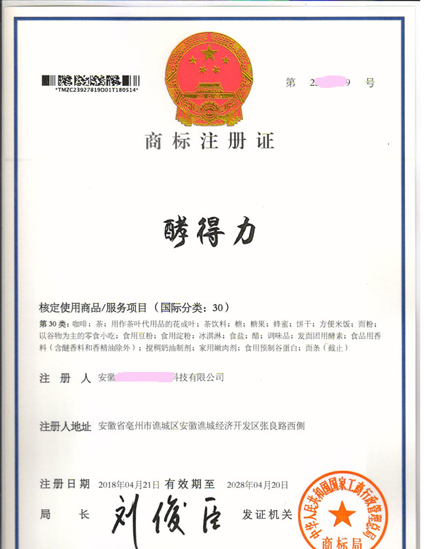“酵得力”30类商标注册证下达