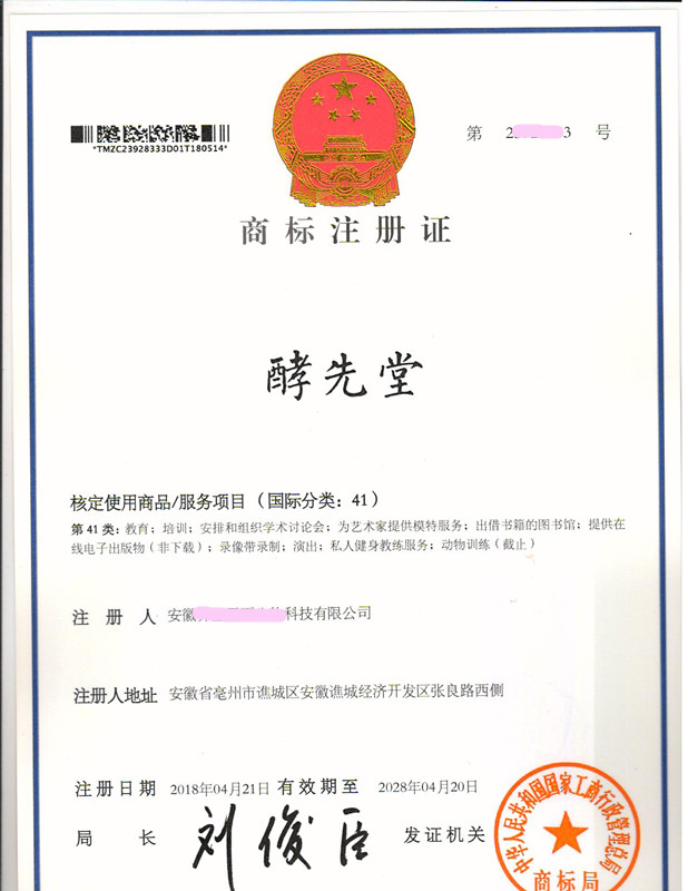 “酵先堂”41类商标注册证下达