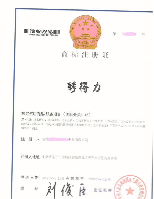 您委托我所代理商标注册申请,名称为“酵得力”42类商标注册证已下达。