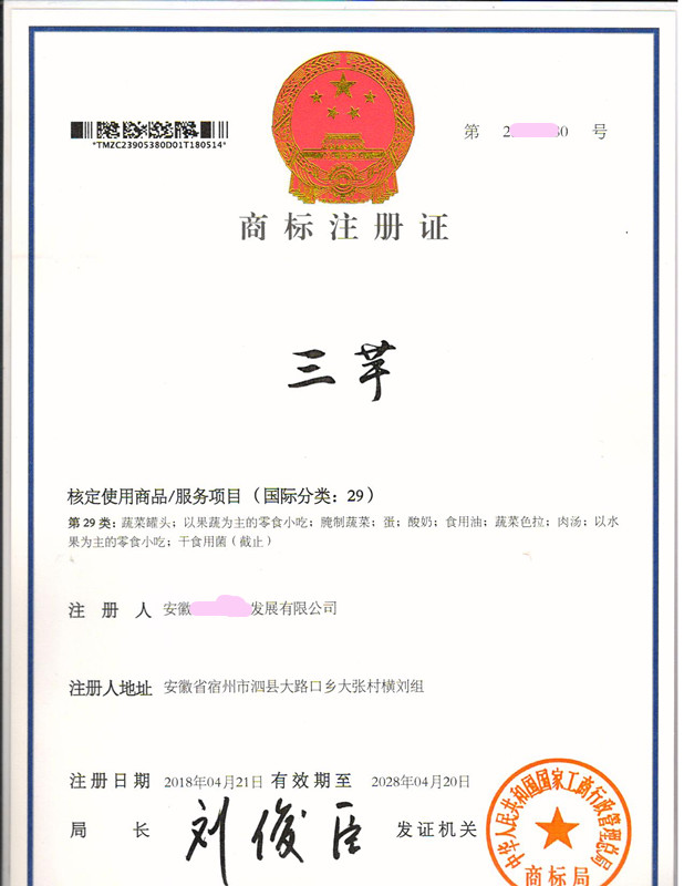 您委托我所代理商标注册申请,名称为“三芋”29类商标注册证已下达。