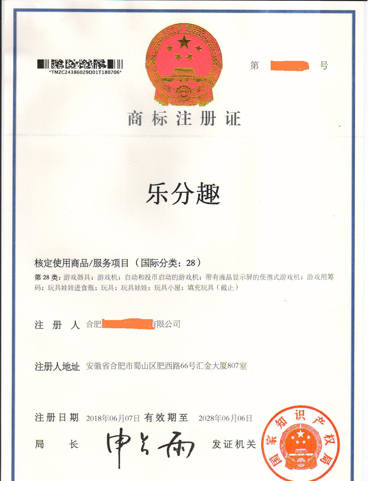 “乐分趣”28类商标注册证下达