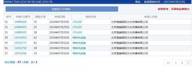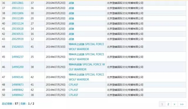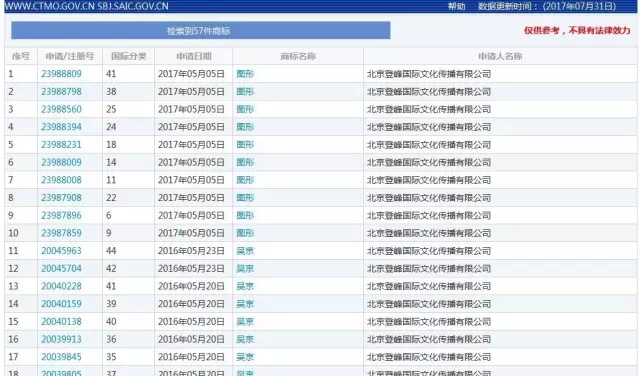 吴京作为大股东的北京登峰国际文化传播有限公司商标注册信息